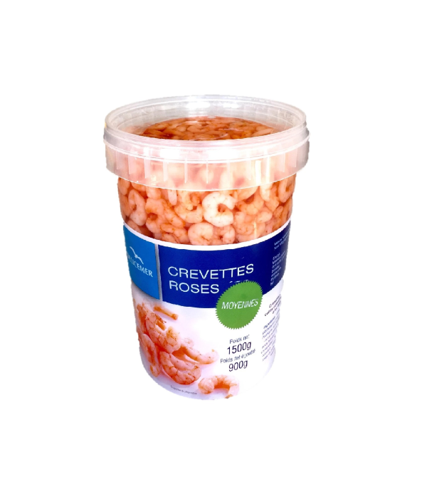 Les crevettes roses moyennes décortiquées cuites en saumure de la marque Delicemer sont prêtes à l’emploi et conditionnées en pot. Le conditionnement total est de 1,5 kg pour un poids net égoutté de 900 g.